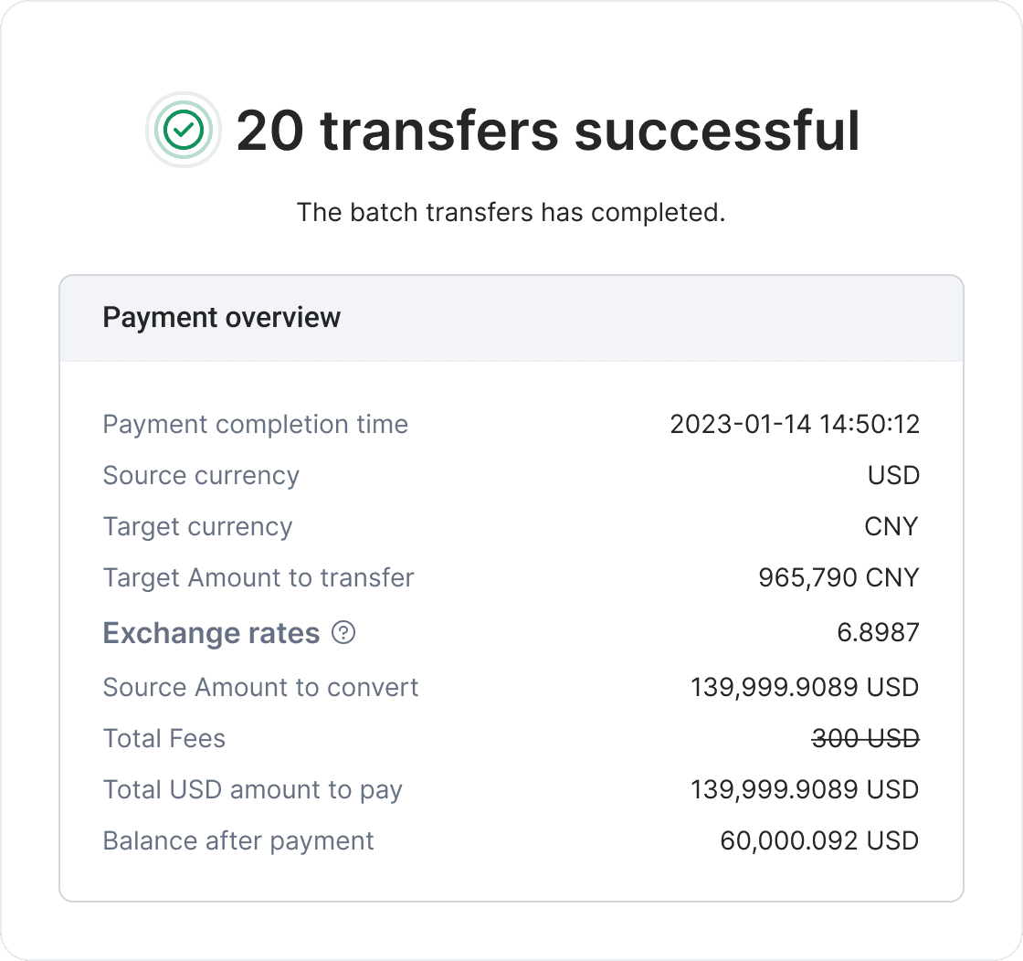 Enhance your global payroll operations with our streamlined solutions, ensuring cost-effective bulk payments to overseas Chinese companies or businesses employing Chinese staff.